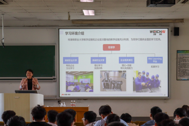 潍柴现代产业公司负责人管丽芳对潍柴产业公司及校企合作进行了相关介绍。她从企业起源、发展、业务板块、全球发展、科技创新成果、企业文化、战略目标等方面介绍了潍柴集团,着重介绍了潍柴现代产业公司的校企合作模式,对教学规划、培养机制、基本薪资、福利体系进行了详细介绍。最后,她鼓励同学们积极参与“潍柴精英班”的选拔,并欢迎大家到潍柴现代产业公司参观学习。
