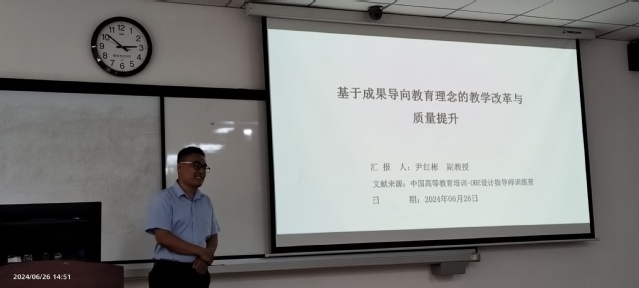 尹红彬副教授结合在中国高等教育培训-OBE设计指导师训练营的培训和自己的教学实践与感受,从什么是OBE、为何做OBE及如何做OBE三个方面与教师们分享了基于成果导向教育理念的教学改革与质量提升。报告通过分析对比传统教育理念和OBE教育理念的不同让大家深刻认知什么是OBE教育,从员工、高校的内部需求和社会、行业外部需求角度分析了为何要做OBE,从教学顶层设计如何进行反向设计、教学过程如何以员工为中心进行改革、教学全过程如何进行持续改进三个方面解读如何做OBE。