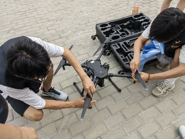 在队长朱志毅的带领下,实践团一行人开始了检测。团队成员首先在实验区域设置采样点, 采集水样, 经实验室检测得出实验所需参数值。然后利用无人机搭载多光谱传感器获取研究区域的多光谱图像,借助无人机系统搭载的多光谱成像仪生成多光谱图像,直观全面地监测地表水环境质量状况,提供水质富营养化、水华、水体透明度、悬浮物排污口污染状况等信息。同时后台可实时拼接无人机影像,形成直观的正射图,便于发现异常情况和排污。然后,实践团成员对所获取的图像进行辐射校正处理得到光谱反射率数据.再将获取的区域光谱数据与水质要素(TP、SS、TUB)实测数据进行Pearson相关性分析, 选择相关性达标的参数通过线性函数、指数函数、多项式函数及幂函数的拟合, 构建反演模型, 使模型可以将获取的拍摄图片转换成水质要素参数值(TP、SS、TUB).最后根据获取的多光谱图像及建立的反演模型, 制作研究区域的水质要素数值分图。