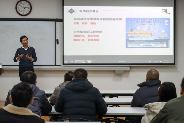 毕勤胜作了题为“探索与创新——高质量基金申报书”的报告。他从自然基金的重要性、工作思路、选题准备以及立项依据等方面系统地介绍了申报基金时的注意事项。他指出,国家自然科学基金作为我国支持基础研究的主要渠道之一,对于科研工作者而言,具有举足轻重的地位。他结合个人经验以及申报时所遇到的问题详细指出了申报失败的可能原因以及解决办法。毕勤胜从选题模糊不清、创新性缺乏、科学问题选择不当三个关键不足之处出发阐述了在申报基金时的常见问题并给出了相关建议。他强调,选题的核心是凝练科学问题,在选题过程中要充分调研和论证,确保所选问题既具有科学性,又具备实际的研究价值和意义。最后,他通过生动有趣的实例讲述了科研工作者所应有的态度,并鼓励在场的青年学者充分发挥自己的创新思维,敢于提出新的观点和方法。