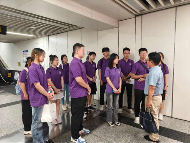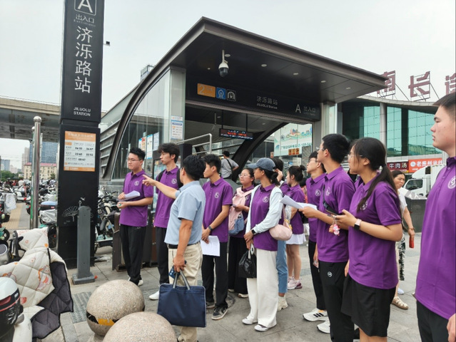 指导老师以济泺路站为例,现场讲解轨道交通站点调研的核心方法与操作规范,包括站出入口布局、周边接驳设施、客流特征记录等关键要素的调研要点,同时强调了调研过程中的安全注意事项与数据采集标准。