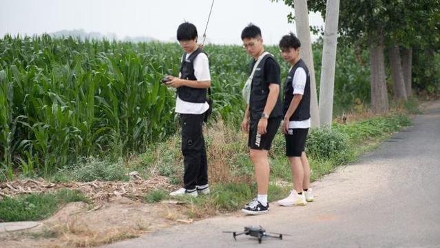 图为创飞科技实践团成员操控无人机巡视杜家村农田 张皓琪摄