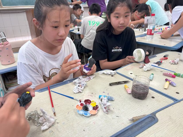 随着一声清脆的“开始“,原本安静的教室立刻被点燃。小朋友们纷纷拿起自己的画笔与颜料,在属于自己的石膏娃娃上面开始了创作。颜料在调色盘里打旋,笑声在课桌间碰撞,每一笔都是童心与创意的热烈握手。在一次次蘸色、描线、修改的过程里,小朋友们学会让心跳慢下来,用耐心把每一次呼吸都变成笔尖的轻舞。
