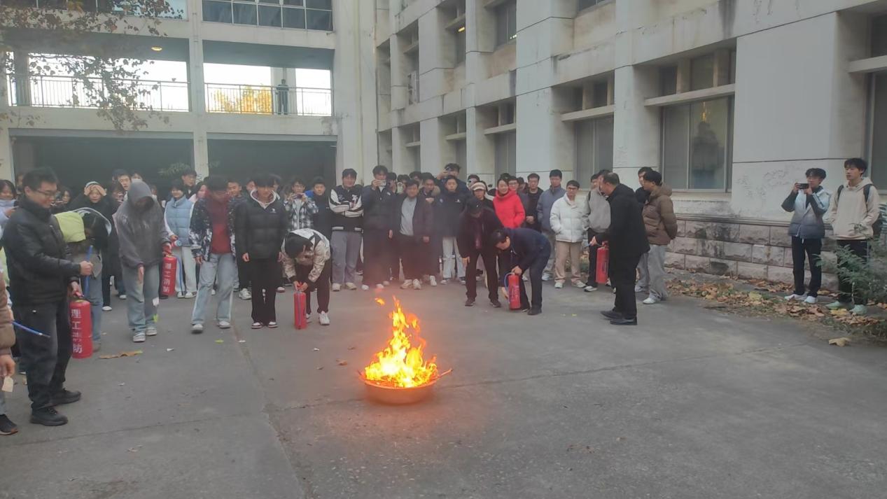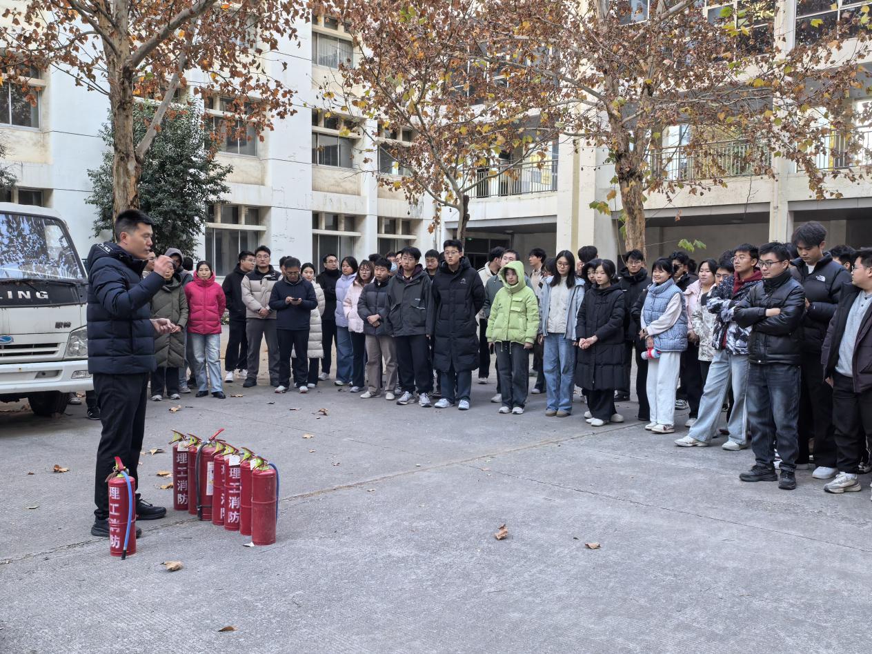 随后,现场依次组织了应急逃生疏散与消防实地演练。参训师生在引导下,按预定路线迅速有序撤离。在机械交通实验楼东侧,集团保卫处工作人员讲解了灭火器的检查要点与规范操作方法,并指导师生进行实操练习,确保掌握初期火灾扑救技能。